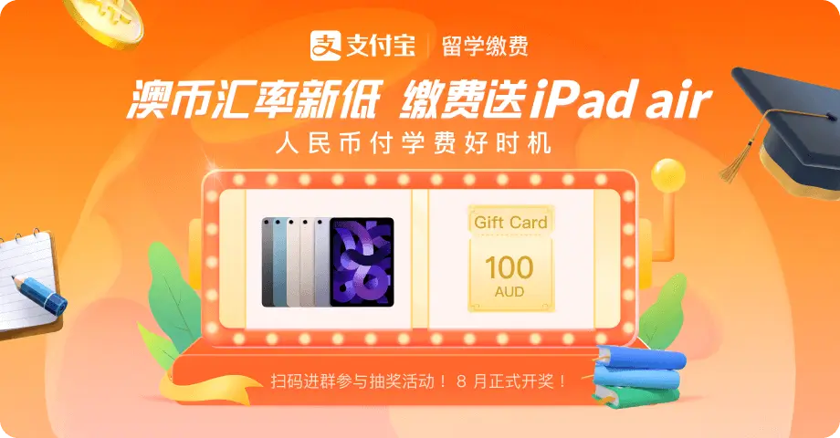 活动期间使用支付宝留学缴费官方小程序缴纳澳洲学费,可进群参与活动抽奖,活动结束时将抽取 25 名幸运用户获奖。