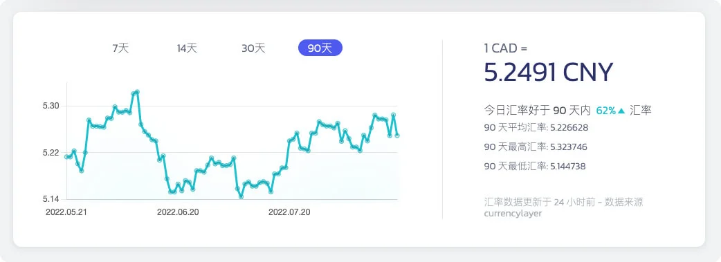 在 Finzc 加元转人民币指南页面中间的汇率查询工具中查看近期加元换人民币的历史汇率价格,汇率工具会自动帮你计算出当前加元兑人民币对比 30 天,90 天内的平均水准。