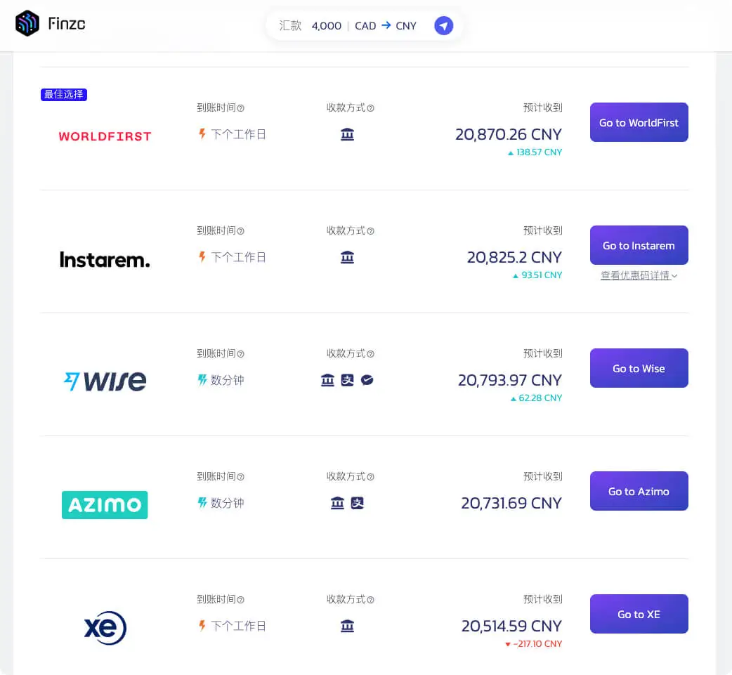 Finzc 汇款比价工具将直接为你展示基于当前汇率的预计到账价格和到账时间,在进行对比之后可以直接点击按钮前往机构官网注册账户,开始加元汇款。